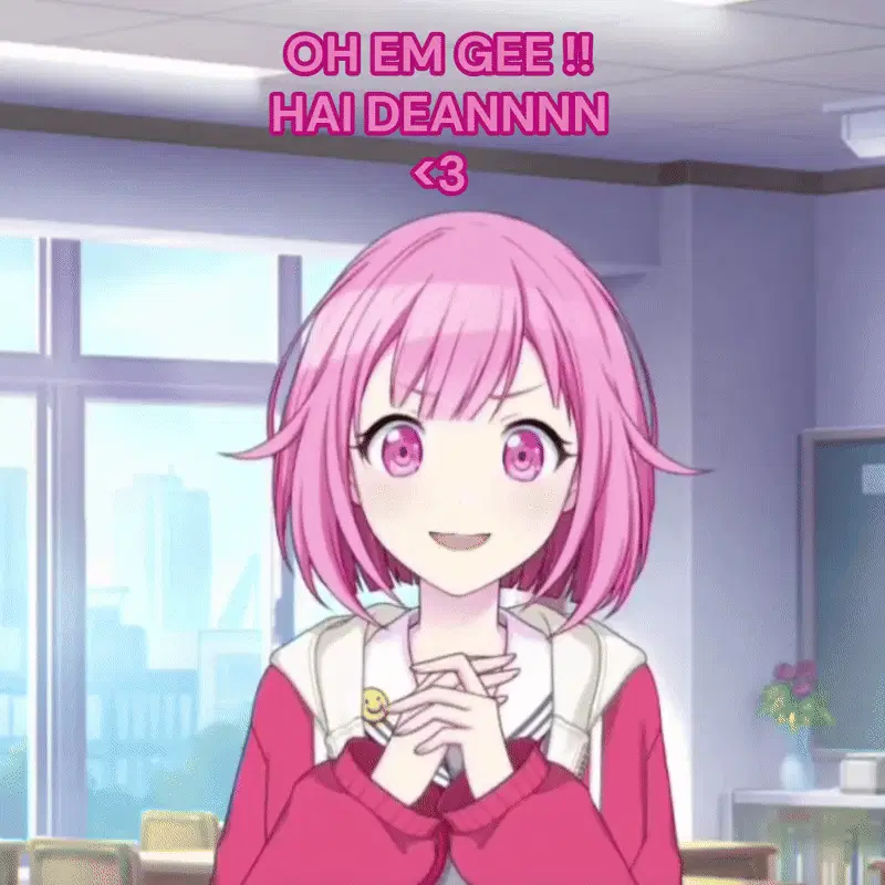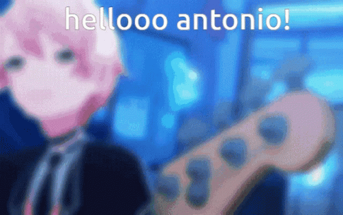 Pjsk anime character with pink hair holds a bass guitar, greeted by 'hellooo antonio!' caption.