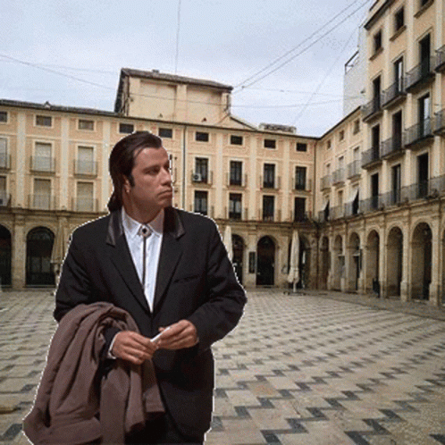 John Travolta, dressed in a suit, appears lost while looking around the historic Plaça De Dins in Alcoy.