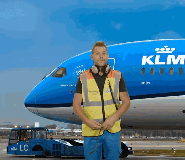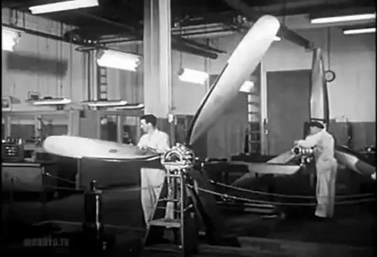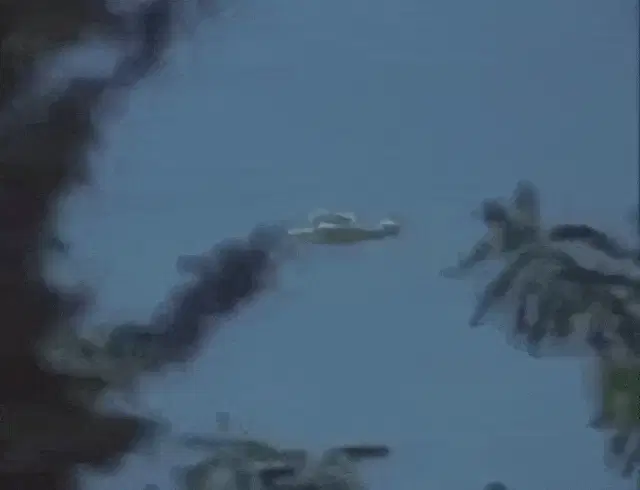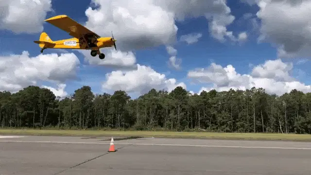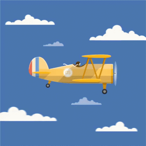 An animated yellow biplane with the number 05 on its side flies through a blue sky with white clouds.