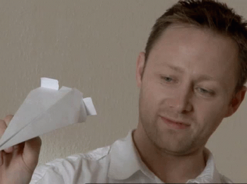 A man in a white shirt holds a paper airplane, looking at it with a slight smile.