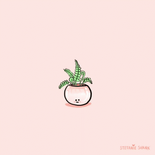 An animated drawing by Stefanie Shank shows a green fern-like plant growing and shrinking in a pink pot on a light pink background.
