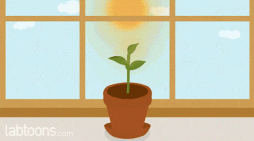 A cartoon plant in a pot grows and bends towards the sunlight streaming through a window, demonstrating phototropism.