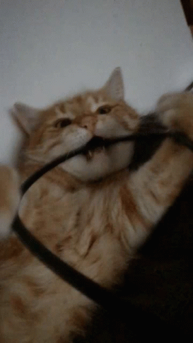 A fluffy orange Plateau Client cat playfully chews on a black cable while lying down.