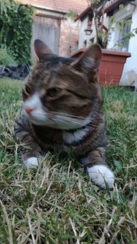 A tabby cat, known as the Plateau Client, relaxes in the green grass, observing its surroundings.