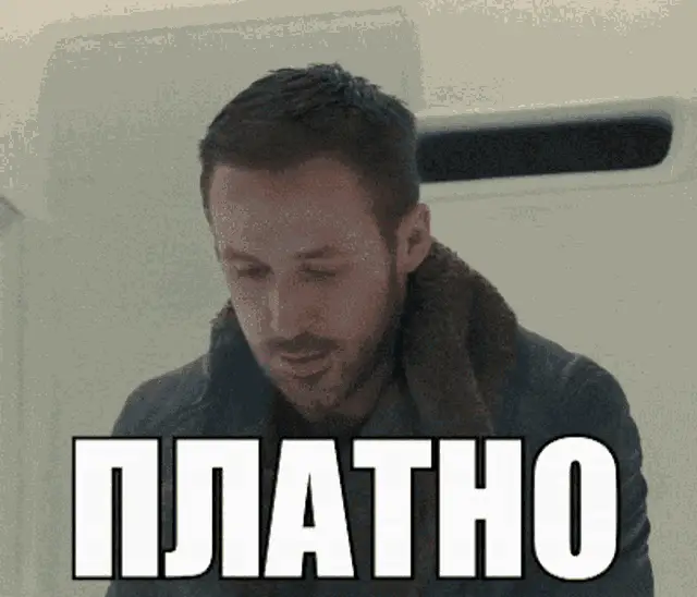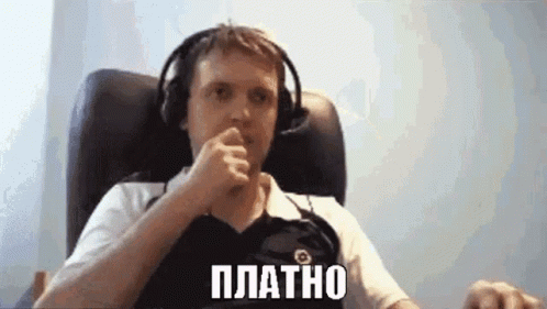 A man wearing headphones reacts animatedly with the Russian word 'платно' (paid) displayed on screen.