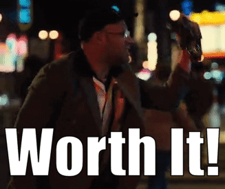 Will from Platonic, played by Seth Rogen, reacts with 'Worth It!' in a city setting.