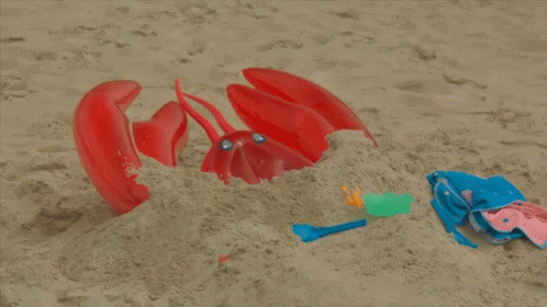 A red sand lobster sculpture is revealed on Playa Langosta as sand blows away, with beach toys nearby.