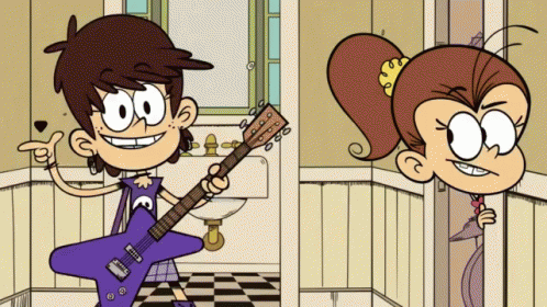 Luna Loud energetically plays her purple star-shaped electric guitar while Luan Loud peeks from behind a door, looking annoyed.