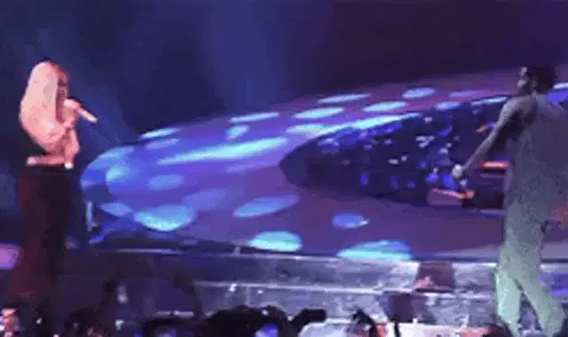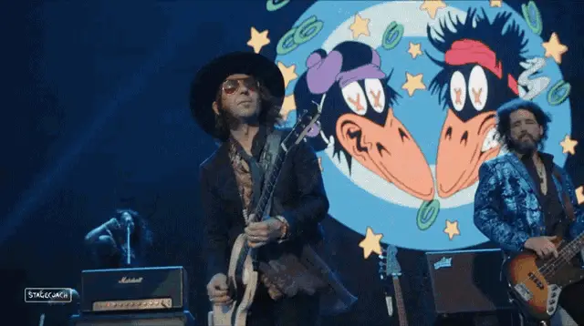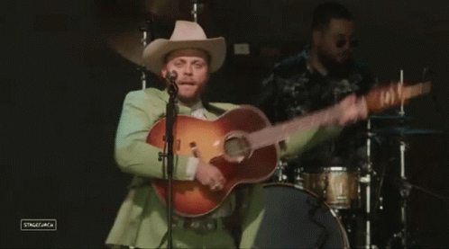 Charley Crockett performing live on stage, playing his acoustic guitar and singing into a microphone.