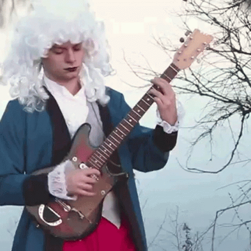 A person in a white wig and historical costume playing an electric guitar, reminiscent of Mac Demarco's style.