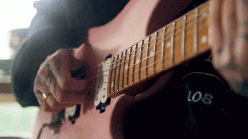 Tim Henson expertly plays a pink electric guitar, strumming and fretting with precision.