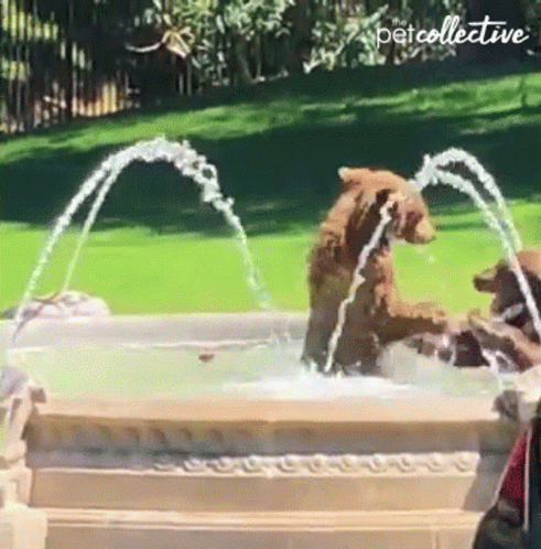 Two brown bears playfully splashing and bathing in a water fountain, featured by The Pet Collective.