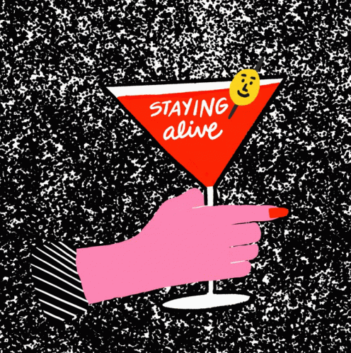 Stylized illustration of a pink hand pointing at a red martini glass with 'STAYING alive' text and a smiley olive.
