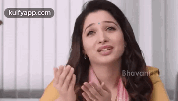 Indian actress Tamannaah Bhatia makes a 'please' gesture, clapping her hands together in a scene from a movie.