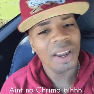 Rapper Plies in a car, delivering the line "Ain't no Chrima bihhh" while wearing a red hat and hoodie.