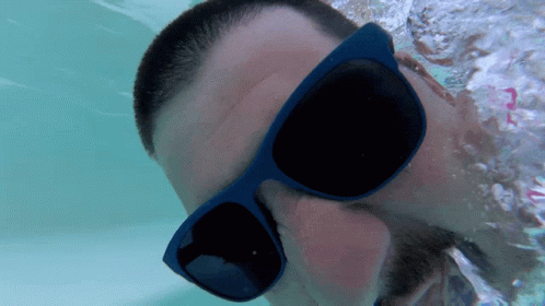Man wearing blue sunglasses swimming playfully underwater, creating a stream of bubbles.
