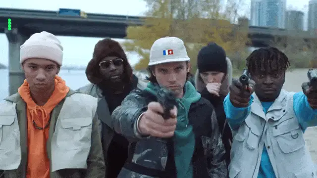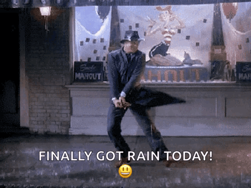 A man in a suit and hat joyfully dances in the rain on a street, celebrating the long-awaited downpour.
