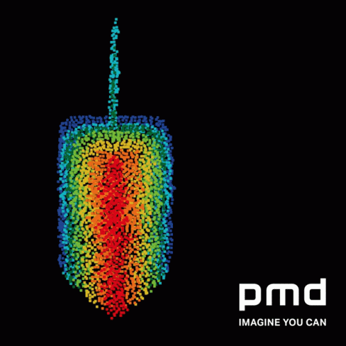 A vibrant rainbow birthday cake with a lit candle and 'Happy Birthday' text, featuring the pmd logo.