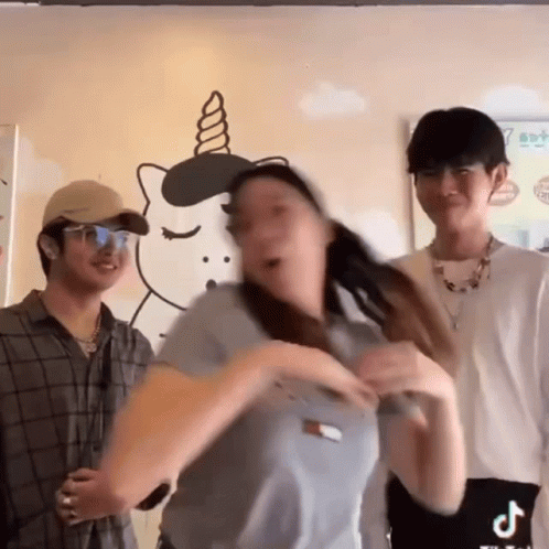 A woman dances energetically in front of a wall featuring a large unicorn drawing, flanked by two men.