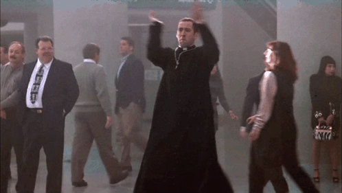 A man in a priest's cassock performs a comedic victory pose dance, parodying a famous action movie scene.
