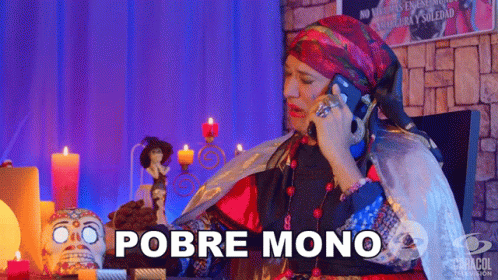 La Bruja Dioselina on the phone, with 'Pobre Mono' caption, from Caracol Television's Sabados Felices.