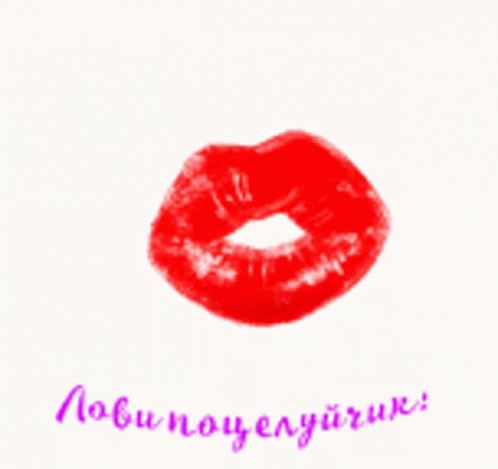 Animated graphic of a pink heart with a red kiss mark, featuring Russian text 'Catch a kiss!'.