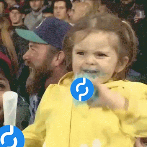 Little girl in yellow jacket reacts with wide eyes, holding Pocket Network POKT logos.