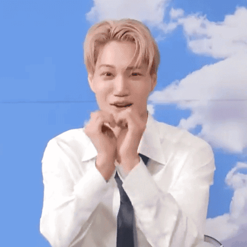 Kai from EXO makes a cute heart hands gesture during Podcast Debutar, smiling sweetly for the camera.