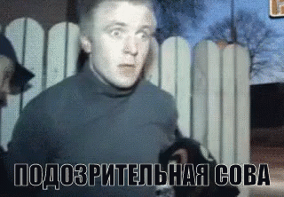A man looking nervous and stressed, part of the 'Suspicious Owl' meme, with Russian text overlay.