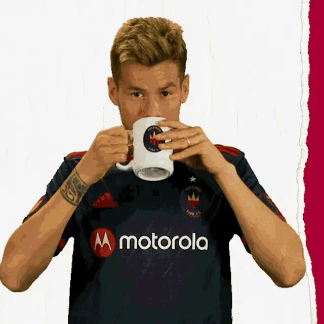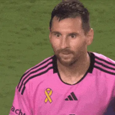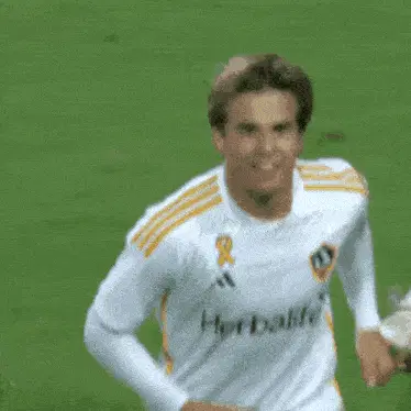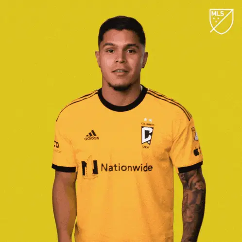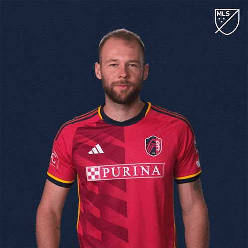 João Klauss De Mello proudly points to his St. Louis City SC jersey logo, featuring the MLS emblem.