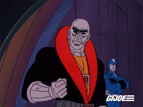 Destro from G.I. Joe points directly at the viewer, with a Cobra Trooper in the background.