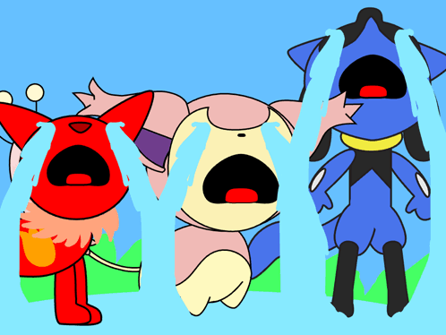 Riolu and Skitty from Pokemon are shown crying with large tears streaming down their faces.