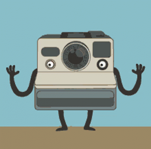 An animated cartoon Polaroid camera character waves, gets a star on its face, and then prints out a photo like a tongue.