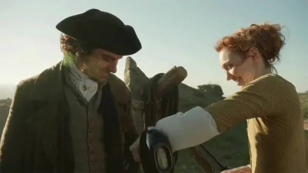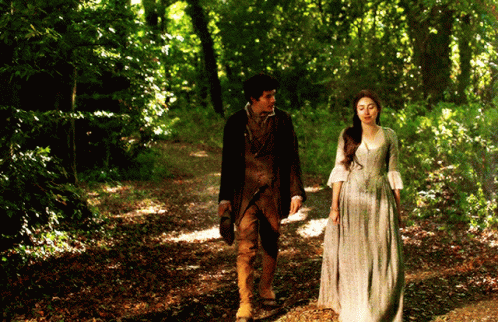 Morwenna Chynoweth and Drake Carne from Poldark share a moment walking through a sun-dappled forest.
