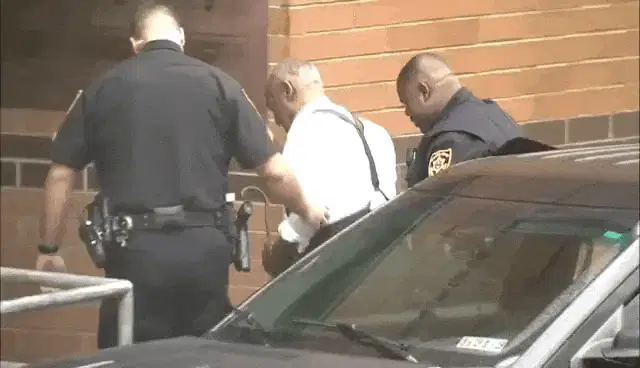 Police officer Nick holds handcuffs towards the camera, with Niko in an orange jumpsuit and another man in the background.
