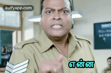 A police officer in uniform makes an angry, questioning face, pointing his finger, with the Tamil word for 'What?' on screen.