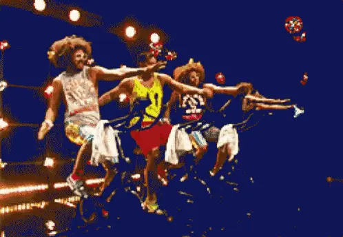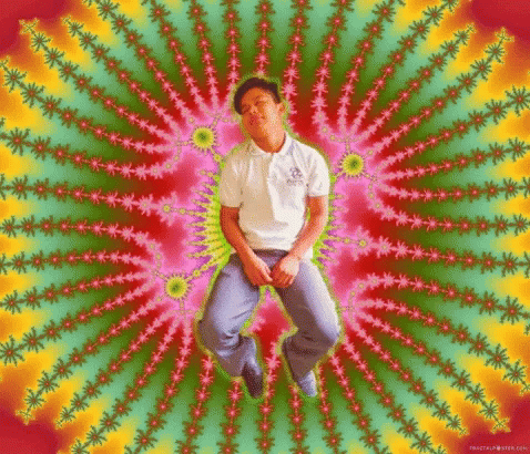 Polin spins in a white polo shirt against a vibrant, psychedelic fractal background.