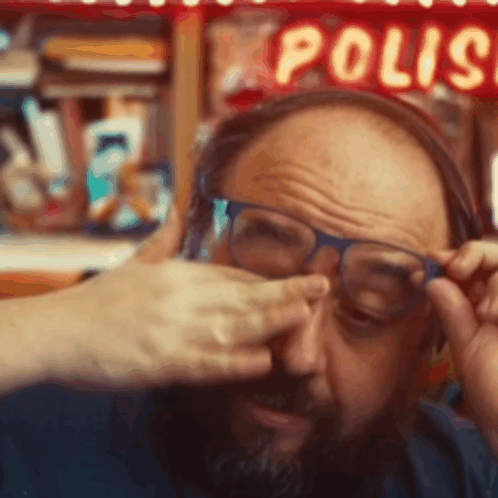 A man with blue glasses and headphones rubs his eye, possibly tired or annoyed, with a 'Polispol' sign in background.