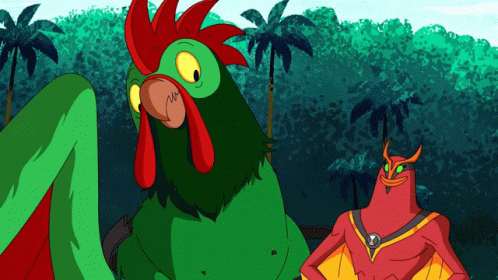 Pollo Feliz, a giant green rooster, laughs alongside Ben10's Stinkfly alien form.
