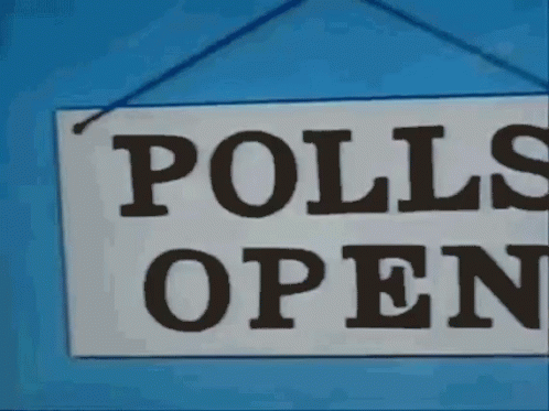 Simpsons characters head to the polls as a 'Polls Open' sign hangs, casting their ballots on election day.