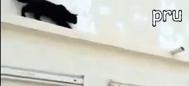 A black cat chases a pigeon on a ledge, with Portuguese meme text appearing on screen.