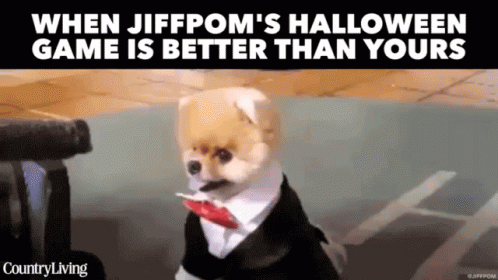 Jiffpom, the Pomeranian puppy, dressed in a dapper tuxedo for Halloween, looking unimpressed.