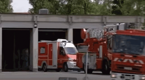 Fire trucks and emergency vehicles at a fire station, possibly for a 'Pompier Cake' event, featuring Ewen.