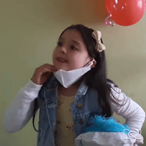 Isabela, a little girl, demonstrates how to properly wear a face mask and gives a thumbs up, promoting safety.