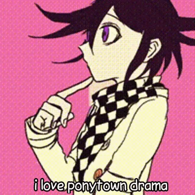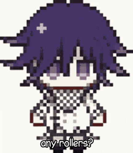 Pixel art Kokichi Ouma from Danganronpa in Ponytown style asks 'any rollers?' with changing eyes.