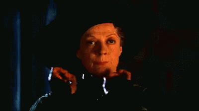 Professor McGonagall in a black hat, holding her hands up as if performing magic.