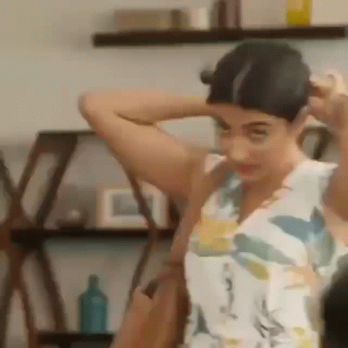 Pooja Hegde fixing her hair in a white dress with a floral pattern.