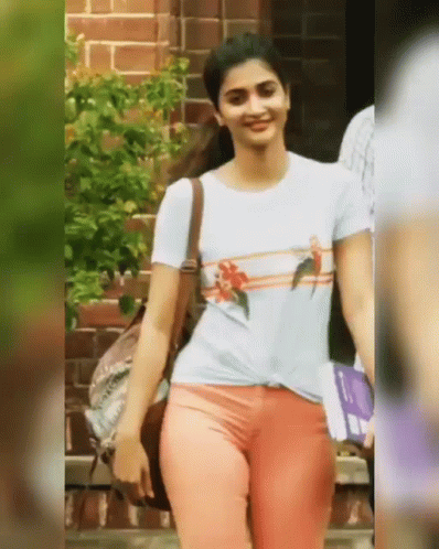 Pooja Hegde walking outdoors, smiling in a light blue t-shirt and peach pants.