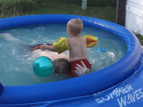Jayden and Shane playing in a Summer Waves inflatable pool, enjoying the water.