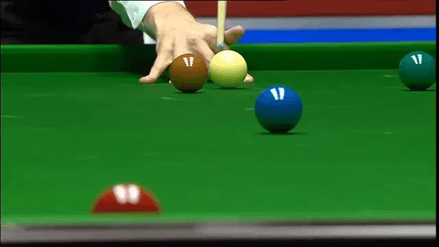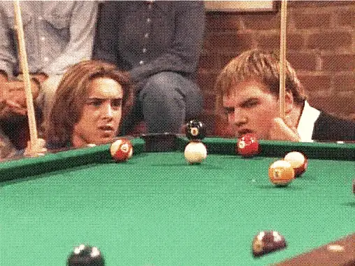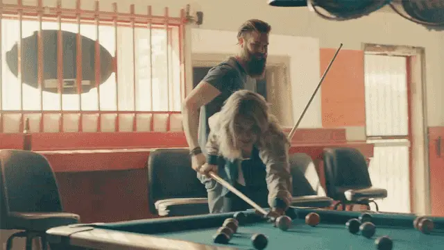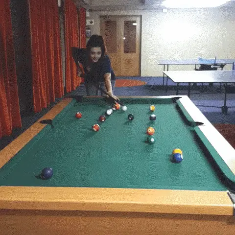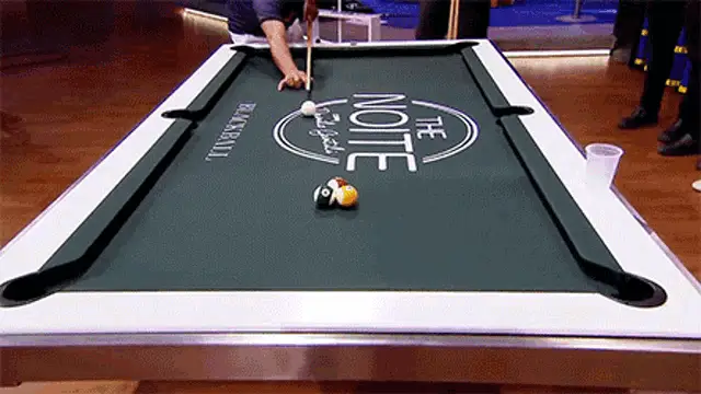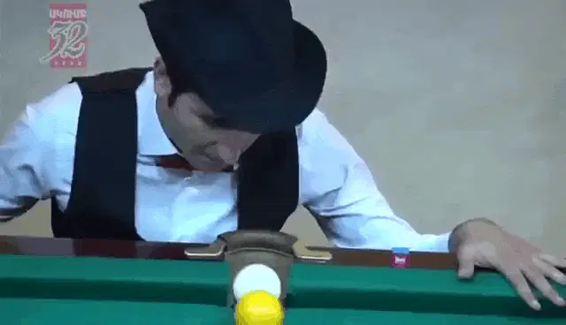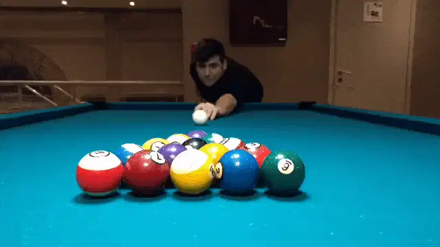A man attempts an unusual billiard shot on a pool table, resulting in all the balls scattering dramatically.